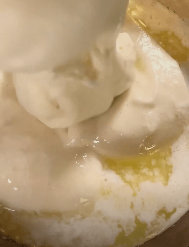 pour into a lined cake pan, gently tap out bubbles, and & bake in a preheated over @ 320°F for 30 – 35 minutes. Insert toothpick in the cake to make sure it’s fully cooked before taking it out.
