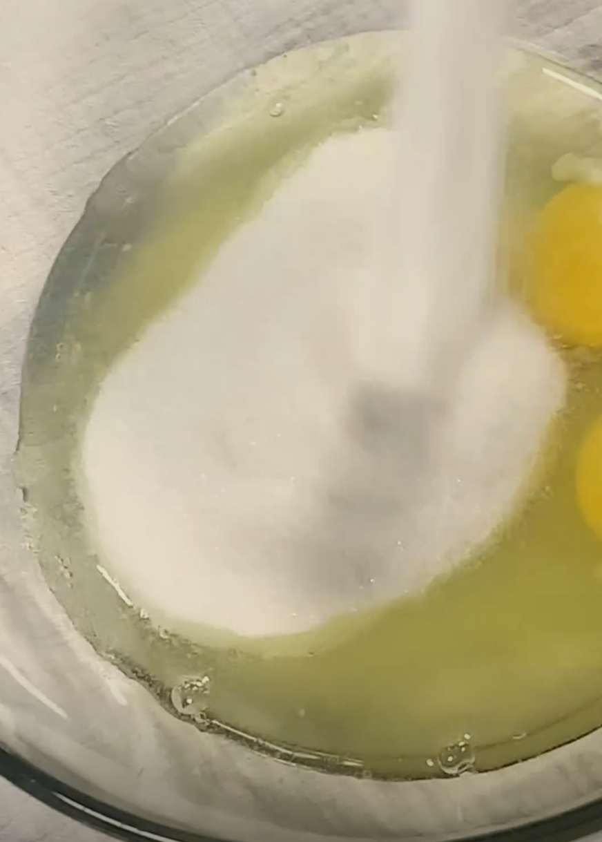 combine eggs and sugar in a bowl, preferably in a metal mixing bowl. Place into hot water bath until temperature reaches about 40°C (104°F).